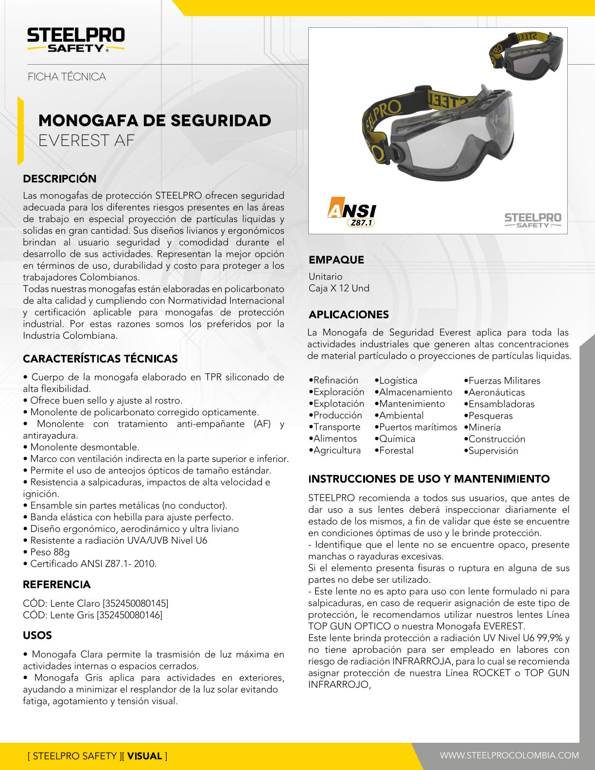*Cuerpo de la monogafa elaborado en TPR siliconado de alta flexibilidad*Ofrece buen sello y ajuste al rostro*Monolente de policarbonato corregido ópticamente con tratamiento Antiempañante (AF) y Antirayadura*Monolente desmontable*Ventilación indirecta*Permite uso de anteojos formulados tamaño estándar*Sin partes metalicas*Banda elástica con hebilla*Ultraliviano*Resistente a radiación UVA/UVB NIVEL U6*Peso 88g*Certificado ANSI Z87.1-2010*Color claro y oscuro*EXENTO DE IVA.