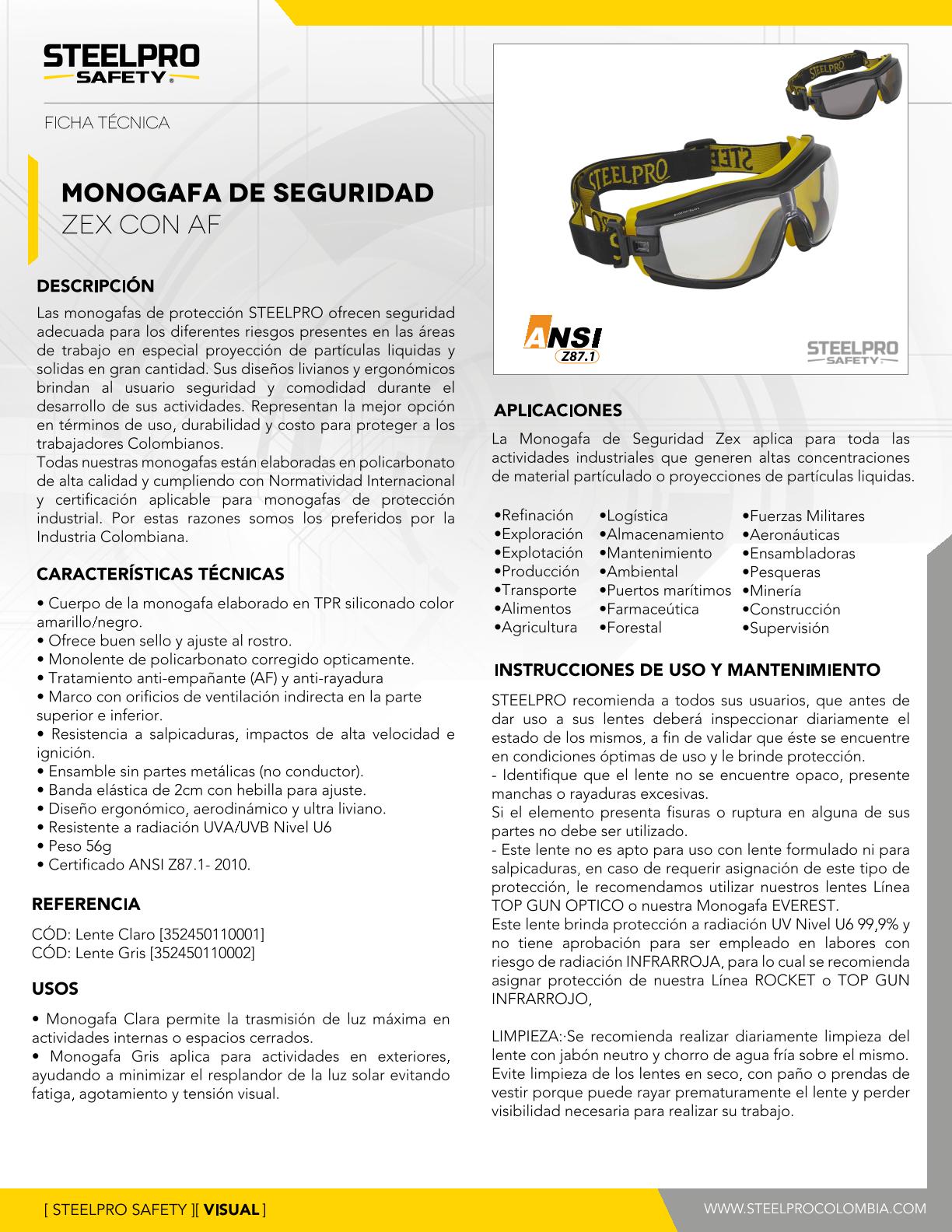 *Cuerpo de la monogafa elaborado en TPR siliconado color amarillo/negro*Ofrece buen sello y ajuste al rostro corregido ópticamente*Tratamiento anti-empañante (AF) y anti-rayadura*Marco con ventilación indirecta en la parte superior e inferior*Resistencia a salpicaduras, impactos de alta velocidad e ignición*Ensamble sin partes metalicas*Banda elástica de 2cm con hebilla para ajuste*Diseño ultra liviano*Resistente a radiación UVA/UVB Nivel U6*Peso 56 gr*Certificado ANSI Z87.1-2010*EXENTO DE IVA*
