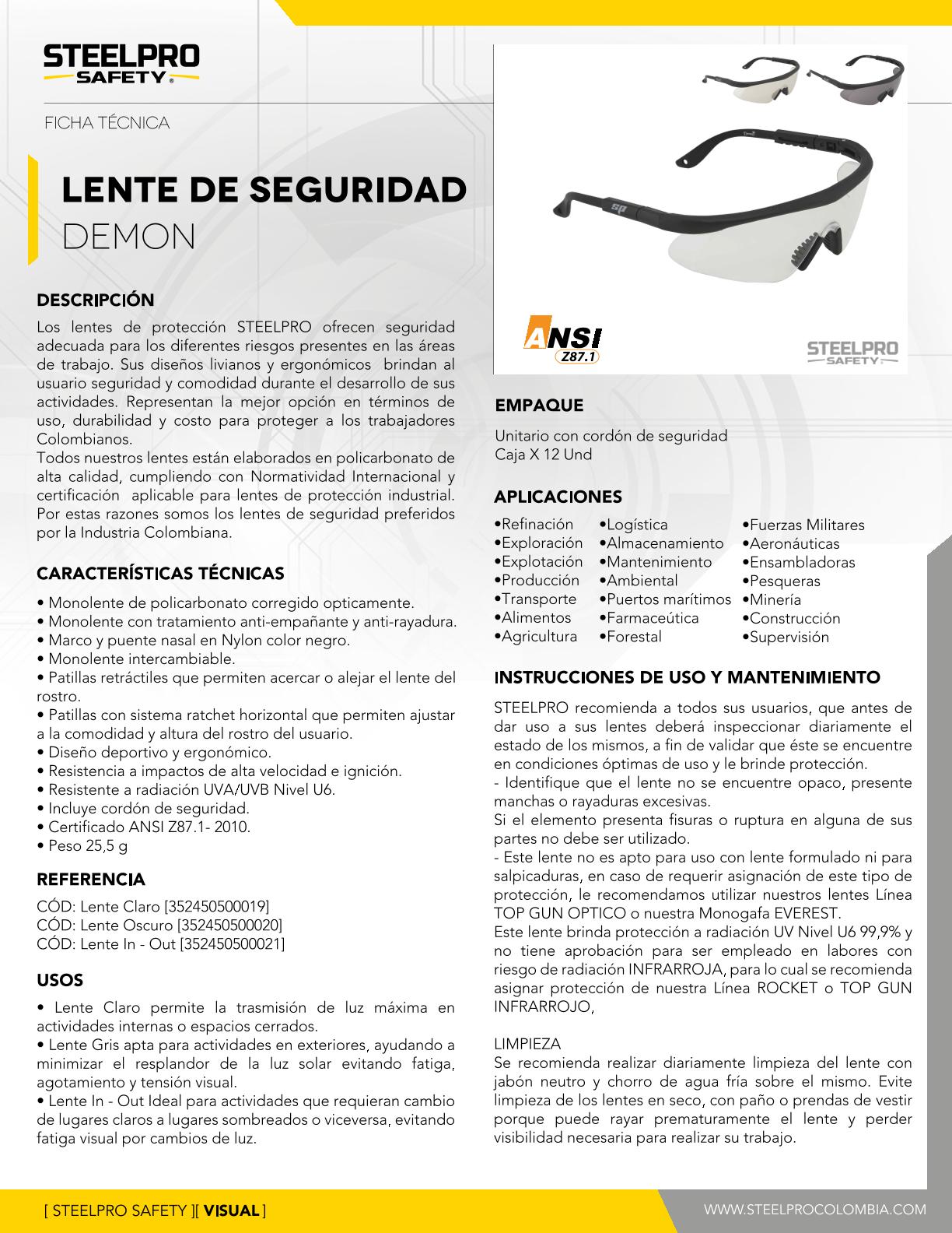 *Monolente de policarbonato corregido opticamente*Con tratamiento anti-empañante (AF) y anti-rayadura*Marco y puente nasal en Nylon color negro*Monolente Intercambiable*Patillas retractiles que permiten acercar o alejar el lente del rostro*Patillas con sistema ratchet horizontal que permite ajustar a la comodidad y altura del rostro*Diseño deportivo*Resistencia a impactos de alta velocidad e ignicion*Resistente a radiacion UVA/UVB Nivel U6*Certificado ANSI Z87.1-2010*Peso 25,5 gr*EXENTO DE IVA